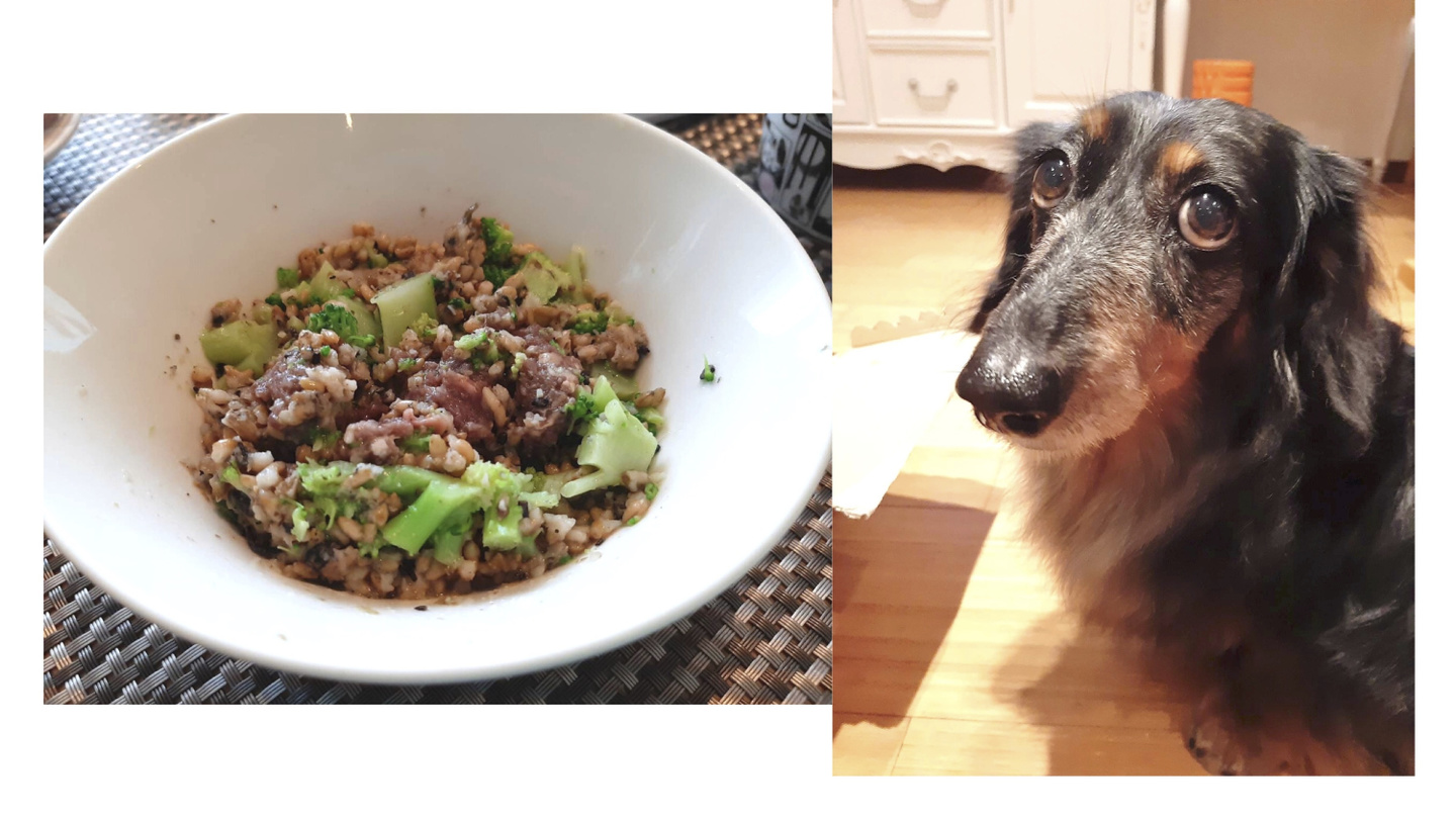 茹でたブロッコリー、コラーゲン粉末、生の馬肉をトッピング。